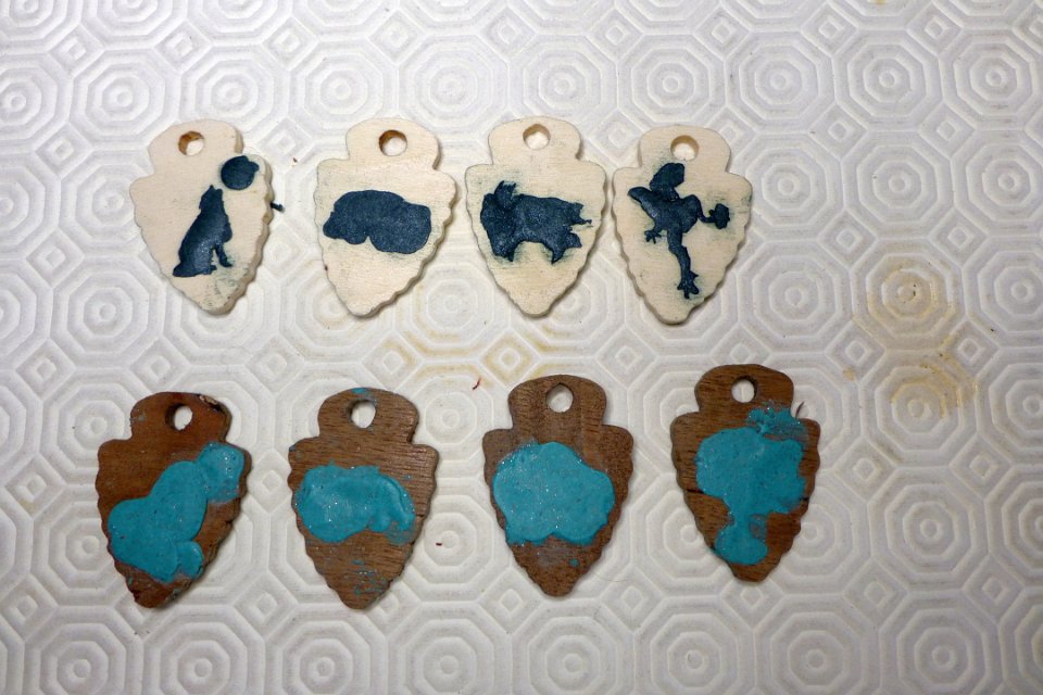 I medaglioni vengo traforati col disegno scelto. L'intaglio viene riempito con Fimo e il gioiello viene cotto in forno per 20-30 minuti a 120°, secondo lo…